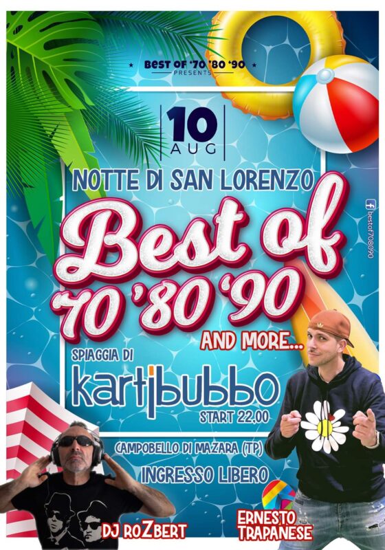 "Best of 70' 80' 90'" presenta durata la notte di San lorenzo a partire dalle ore 22:00, presso la spiaggia di Kartibubbo, una splendida serata danzante sotto le stelle.