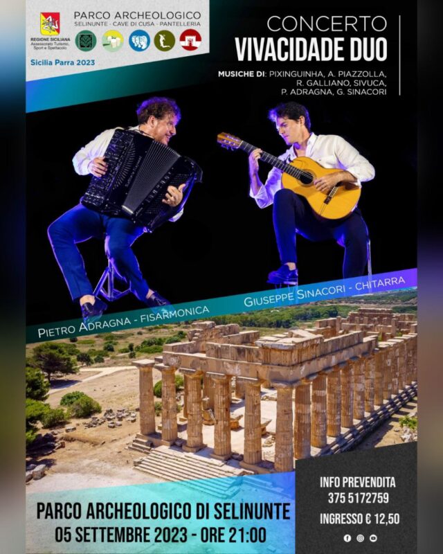Concerto del Vivacidade Duo, composto da Pietro Adragna e Giuseppe Sinacori, all'interno della Rassegna Sicilia Parra nella suggestiva Collina Orientale del Parco Archeologico di Selinunte martedì 5 settembre alle ore 21:00.