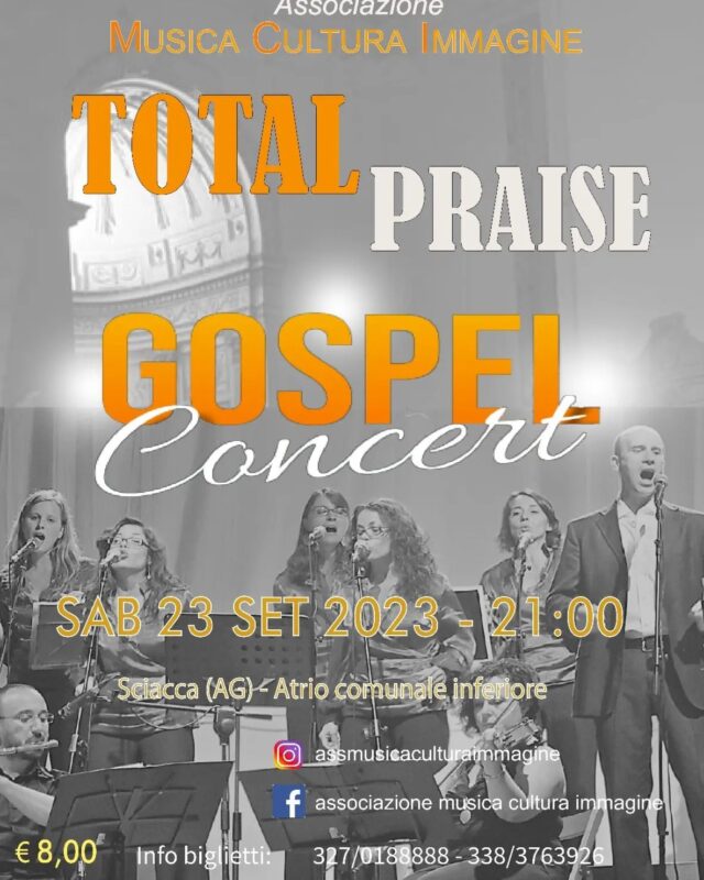 Nella serata di sabato 23 settembre alle ore 21:00 si terrà, presso l'Atrio Inferiore del Municipio del Comune di Sciacca, "Total Praise", uno spettacolo di musical gospel e spiritual tenuto dall'associazione "Musica Cultura Immagine".